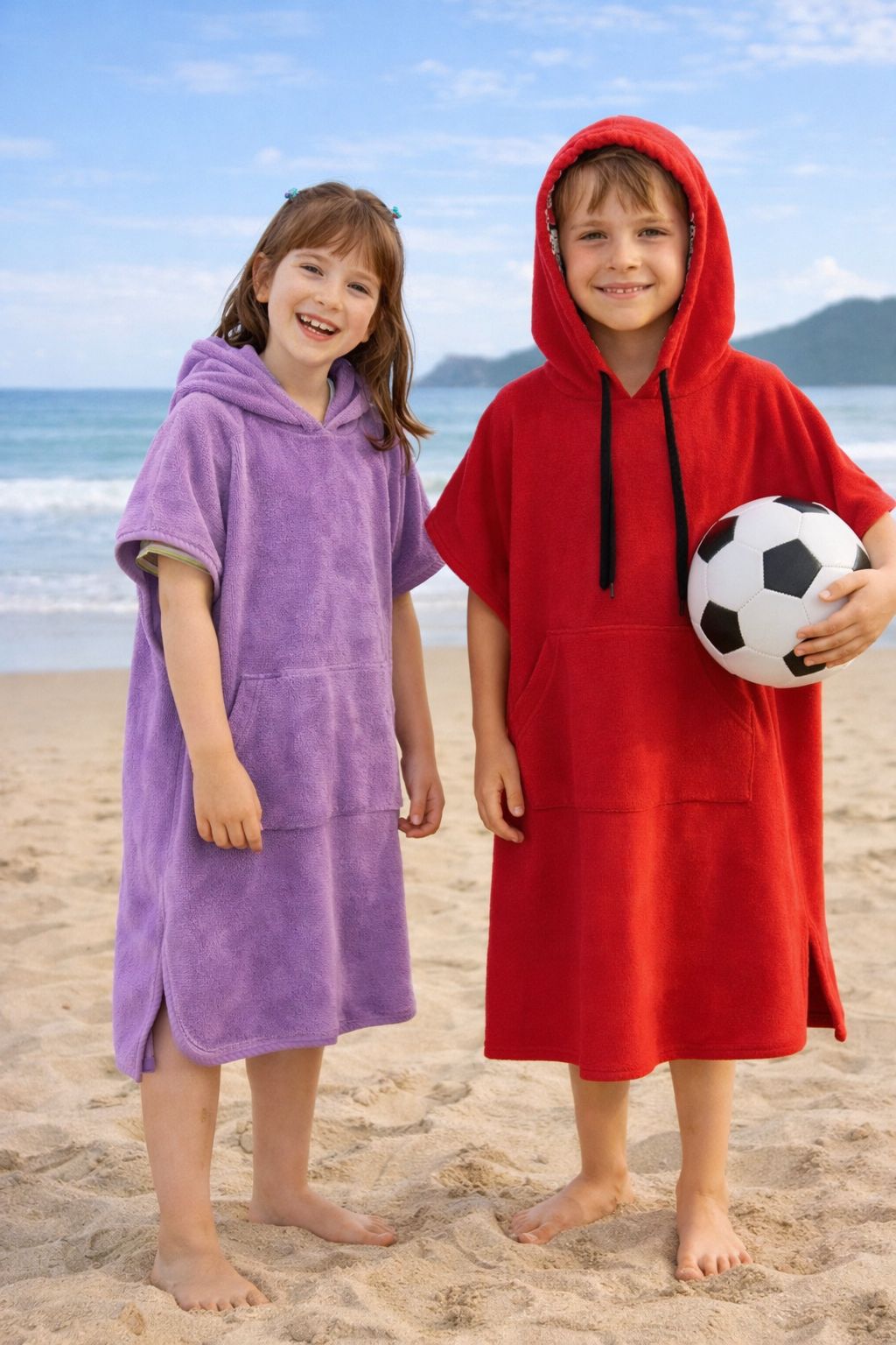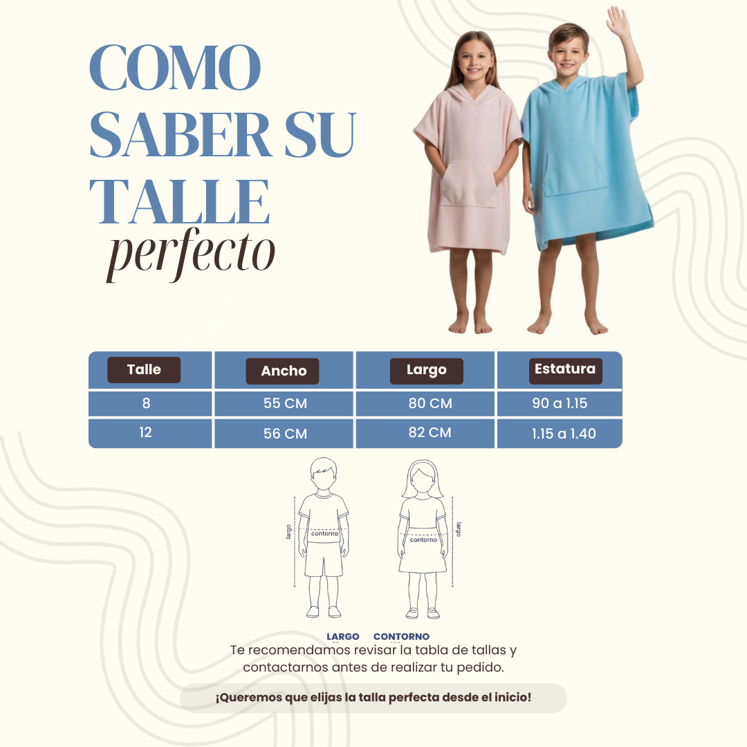 El diseño tipo poncho con capucha permite que se lo pongan y saquen sin ayuda, fomentando independencia y comodidad.